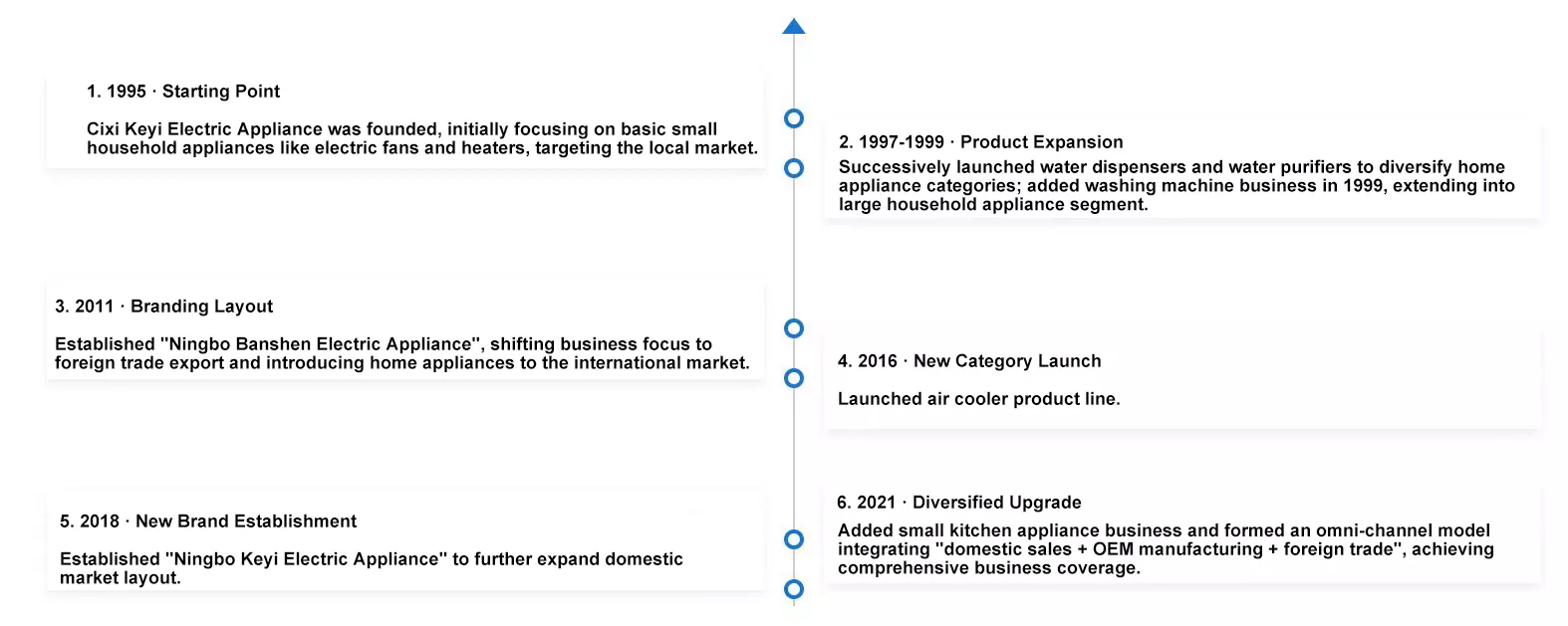 Dzięki dziesięcioleciom stałego rozwoju firma Ningbo Keyi Electric Appliance Co., Ltd. przeszła następującą drogę: W 1995 roku powstała firma Cixi Keyi Electric Appliance, początkowo skupiając się na rynku lokalnym i zajmując się głównie drobnym sprzętem gospodarstwa domowego, takim jak wentylatory elektryczne i grzejniki.